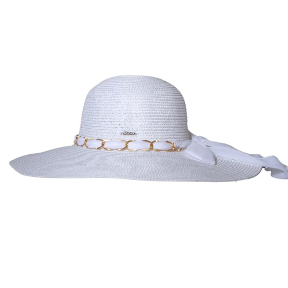 - Stylowy i kobiecy biały kapelusz słomkowy z dekoracyjnym łańcuszkiem i kokardą to idealny dodatek na ciepłe, słoneczne dni. Szerokie rondo skutecznie chroni twarz, szyję i ramiona przed promieniami UV, a lekki, przewiewny materiał zapewnia komfort nawet w upały. Subtelna biała kokarda z tyłu dodaje uroku i klasy, a złoty lub srebrny łańcuszek podkreśla elegancki charakter kapelusza.