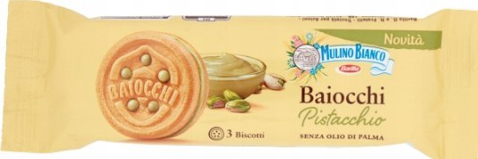 Mulino Bianco Baiocchi z kremem pistacjowym to kruche, złociste ciastka wypełnione delikatnym, aromatycznym nadzieniem z pistacji. Każdy kęs to doskonałe połączenie chrupiącego ciasta i kremowej słodyczy - idealna przekąska do kawy, herbaty lub w podróży.
