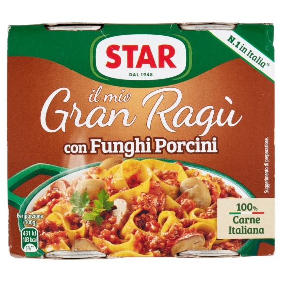 - STAR GRAN RAGÙ z Borowikami to wyjątkowy włoski sos mięsny wzbogacony o intensywny smak borowików. Stworzony z wysokiej jakości mięsa, dojrzałych pomidorów i starannie dobranych przypraw, oferuje głęboki, leśny aromat i idealną konsystencję. Gotowy do użycia - wystarczy podgrzać i podać z ulubionym makaronem. W zestawie 2 porcje po 180 g - praktyczne rozwiązanie na szybki i smaczny obiad.