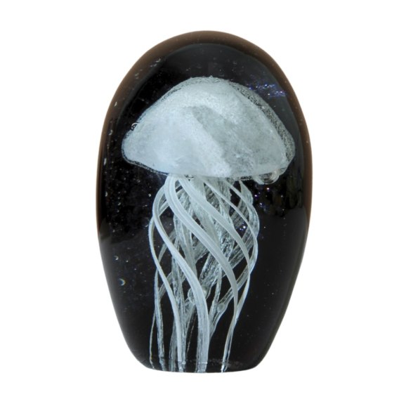 - Stylowa szklana dekoracja z białą meduzą, zamknięta w czarnej, transparentnej bryle szkła. Ręcznie wykonana w stylu Murano, zachwyca precyzyjnym detalem i unikalnym efektem przestrzennym. Idealna do eleganckich wnętrz, dodając im nowoczesnego i artystycznego charakteru.