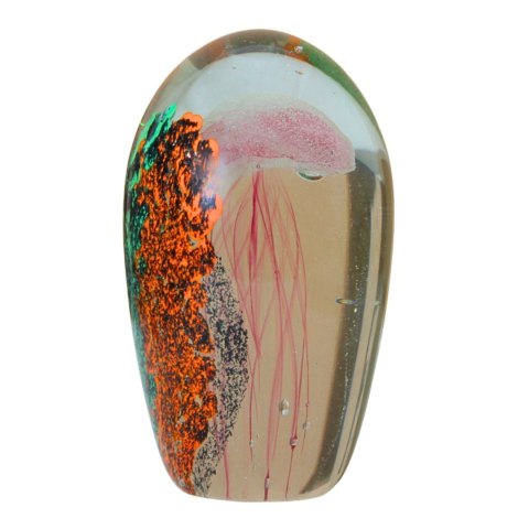 - Wyjątkowa szklana dekoracja z meduzą w stylu Murano. Elegancka, ręcznie wykonana ozdoba łączy w sobie artystyczne szkło i efektowne dwukolorowe tło, które nadaje głębi kompozycji. Wewnątrz znajduje się misternie wykonana meduza, sprawiająca wrażenie unoszenia się w wodzie.