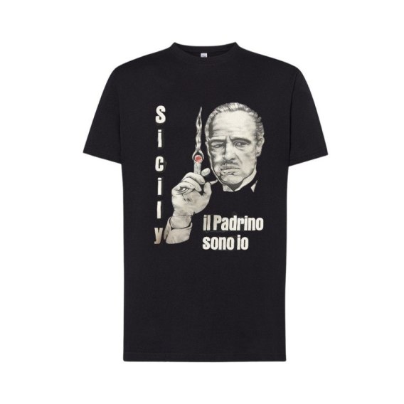 Stylowa czarna koszulka T-shirt Padrino w rozmiarze M, wykonana w 100% z wysokiej jakości bawełny, inspirowana kultowym filmem Ojciec Chrzestny - idealny wybór dla fanów włoskiego kina i unikalnego stylu. Miękki, oddychający materiał zapewnia komfort noszenia oraz trwałość, a klasyczny czarny kolor i charakterystyczny nadruk Padrino dodają koszulce wyrazistego włoskiego klimatu. Doskonała na co dzień, świetnie pasuje do różnych stylizacji, podkreślając miłość do kina i włoskiej kultury. Idealny pomysł na prezent dla miłośników filmu, oryginalnych gadżetów i włoskiej mody.