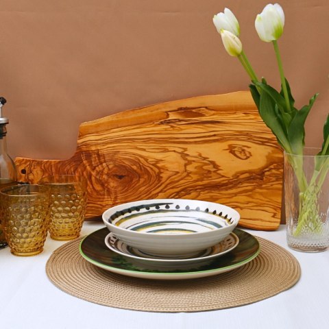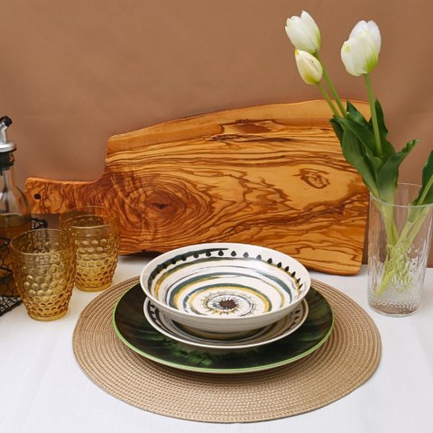 - Talerz płaski APULIA o średnicy 27 cm to elegancki wybór do serwowania głównych dań, obiadów oraz posiłków na większe okazje. Wykonany z wysokiej jakości ceramiki, talerz wyróżnia się pięknym zielonym kolorem, który wprowadza naturalny i świeży akcent do każdego stołu. Dzięki swojej dużej średnicy, jest idealny do serwowania większych porcji dań, zarówno na co dzień, jak i na specjalne okazje. Produkcja we Włoszech zapewnia doskonałą jakość, a ceramika charakteryzuje się trwałością, odpornością na